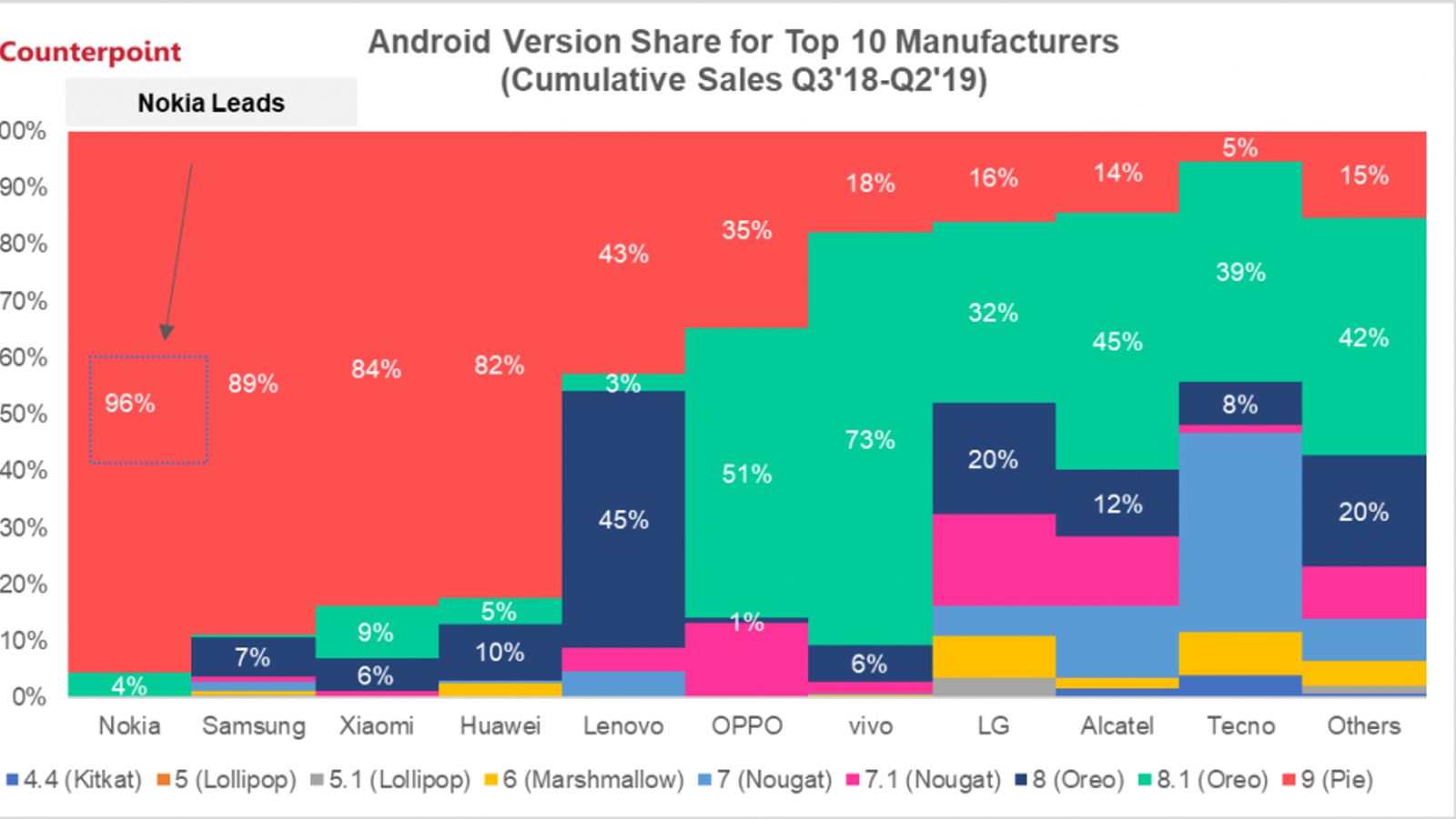 Бесспорным победителем стала компания HMD Global со смартфонами Nokia. Согласно этому графику, 96% всех смартфонов Nokia, выпущенных с третьего квартала прошлого года, работают под управлением Android 9 Pie.