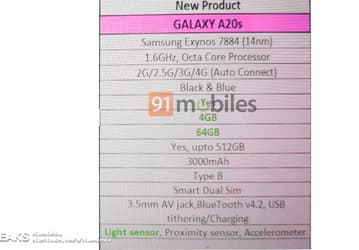 Смартфон оснащен однокристальной системой Samsung Exynos 7884, 4 ГБ оперативной и 64 ГБ энергонезависимой флэш-памяти