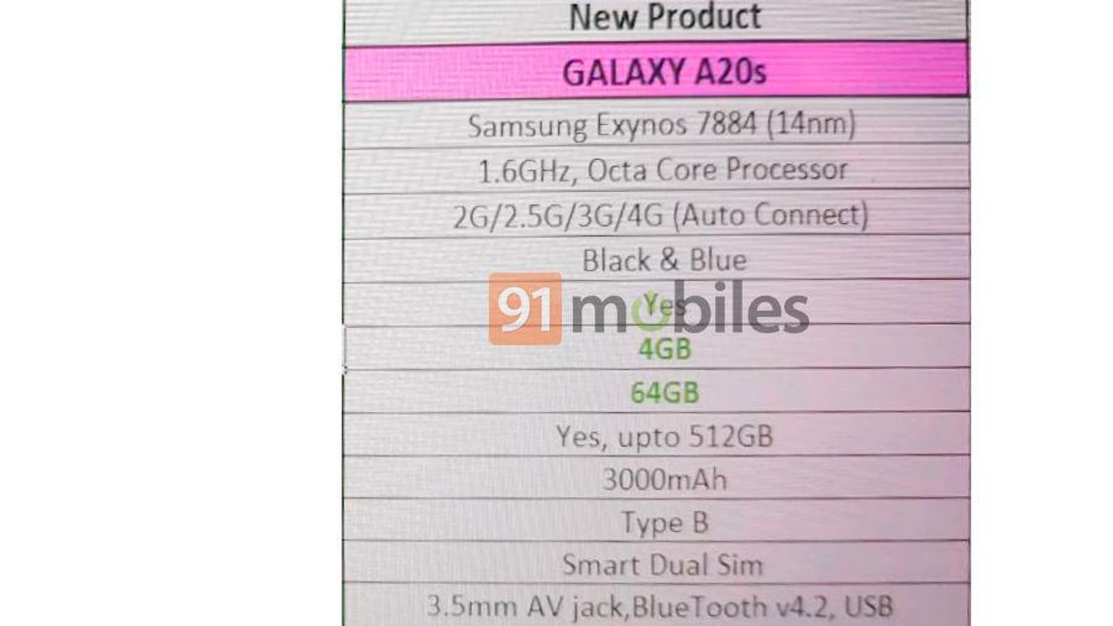 На сайте Slashleaks опубликовали характеристики смартфона Samsung Galaxy A20s, который должен быть представлен в скором времени.
