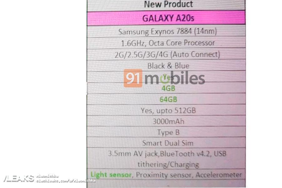 На сайте Slashleaks опубликовали характеристики смартфона Samsung Galaxy A20s, который должен быть представлен в скором времени.