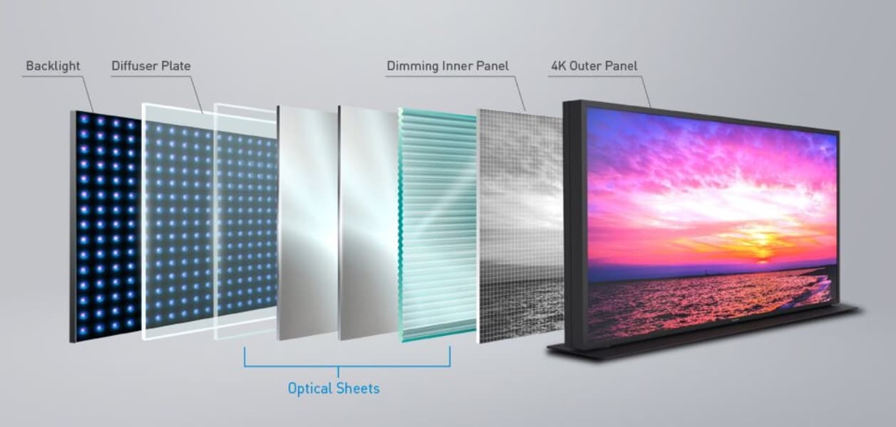Как можно видеть на изображении, фактически телевизор имеет две панели: обычную ЖК и монохромную. Последняя используется для модуляции света, поступающего от подсветки. Благодаря этому устройство способно «передавать» определённое количество света от подсветки на отдельный конкретный пиксель, что делает технологию схожей с OLED.