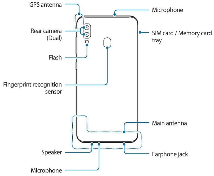 Эти схематичные картинки явно взяты из официальной инструкции, так что им вполне можно доверять. Как видно, Galaxy M10s окажется лучше предшественника хотя бы потому, что получит порт USB-C и сканер отпечатков пальцев в традиционном месте — на тыльной панели.
