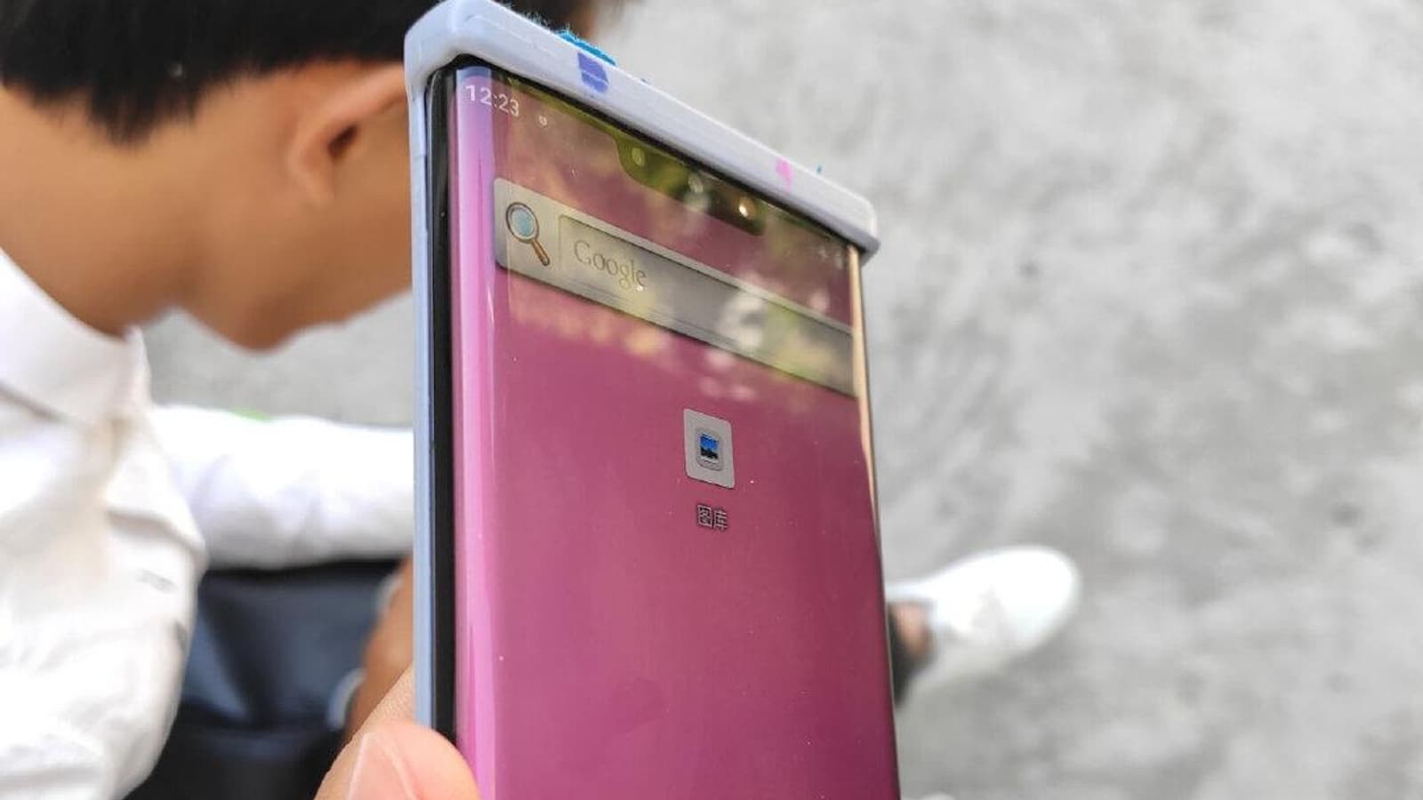 Эта фотография демонстрирует сильно изогнутый по бокам дисплей устройства, который окрестили экраном-водопадом, а также довольно большую челку в центральной верхней части экрана, где разместились сразу три датчика изображения системы фронтальных камер.