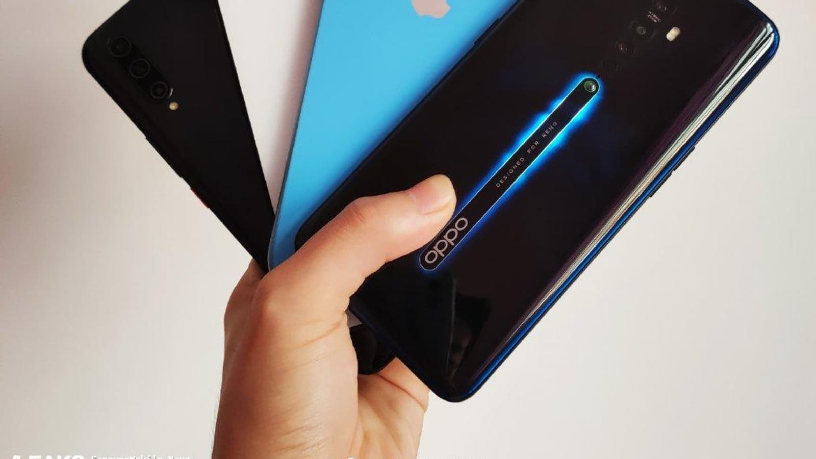 На первой фотографии Google Pixel 4 в сравнении с iPhone XR и Oppo Reno, а также с неизвестным смартфон, оснащенным тройной основной камерой, размещенной в вертикальном блоке в левом верхнем углу задней панели.