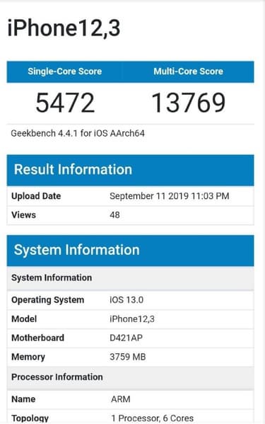 Благодаря новейшей SoC Apple A13 смартфон Apple набрал 5472 балла в однопоточном тесте и почти 14 000 баллов в многопоточном. Для сравнения, модели на SoC Kirin 980 набирают 3200 и 10 000 баллов, а смартфоны на SoC Snapdragon 855 — 3500 и до 11 000 баллов.