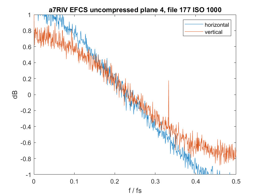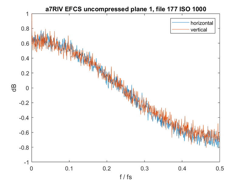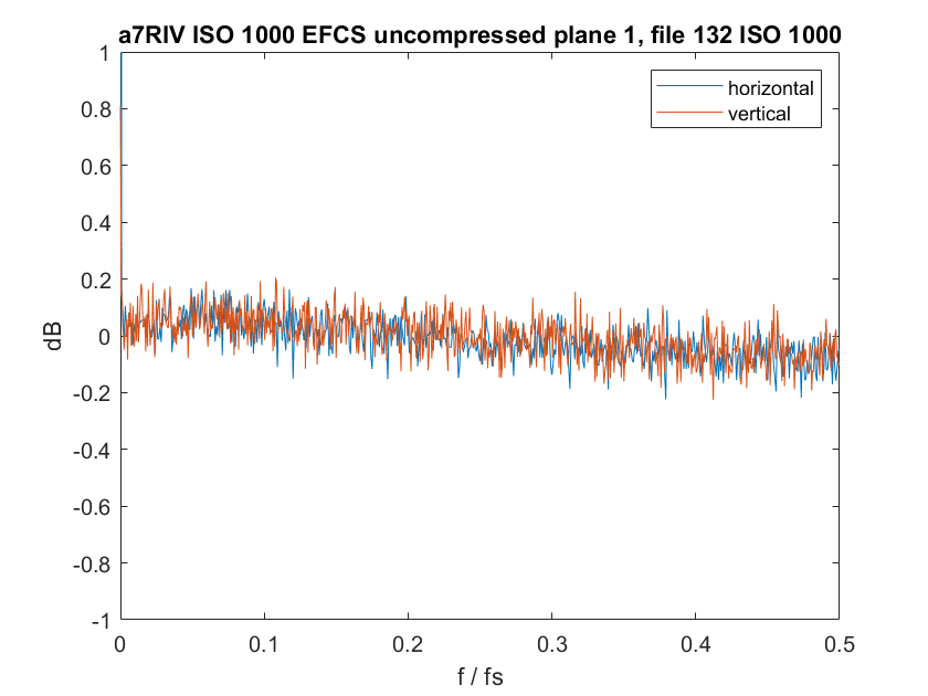 По горизонтальной оси отложены значения пространственных частот, отнесенные к частоте дискретизации камеры, а по вертикальной оси — значения шума. В отсутствие шумоподавления график стремится к горизонтальной линии. Особенно выражена обработка в синем канале (заключительный график). Предположительно, это связано с использованием части пикселей для фазовой фокусировки.