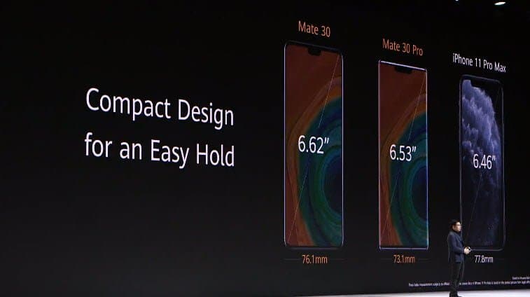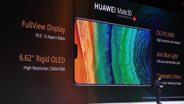 У Huawei Mate 30 плоский экран AMOLED имеет диагональ 6,62 дюйма при разрешении 2340 х 1080 пикселей, 6/8 оперативной и 128 ГБ флэш-памяти. Емкость аккумулятора равна 4200 мА•ч, поддерживается такая же быстрая зарядка. Смартфон соответствует степени защиты IP53.