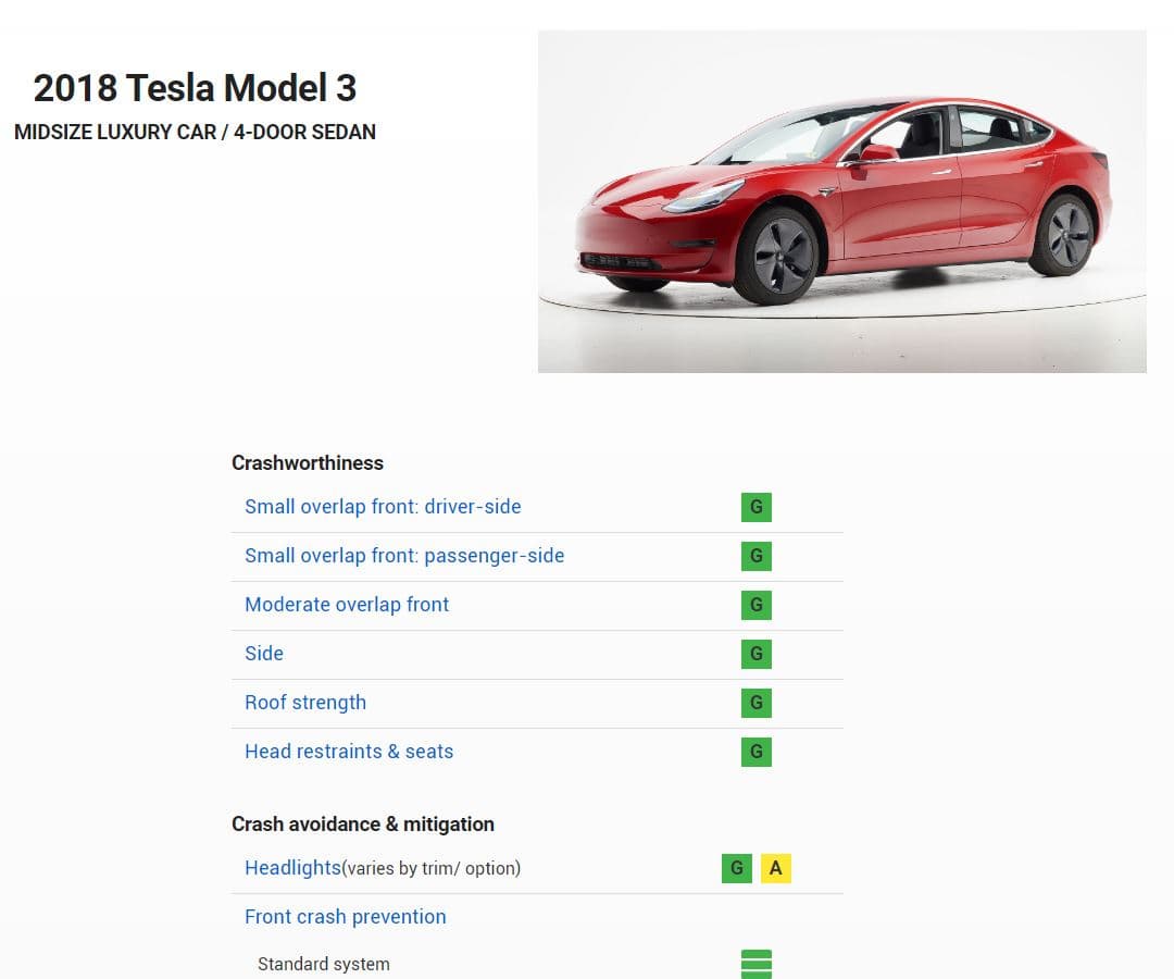 Tesla Model 3 получила высшую оценку за безопасность во всех категориях. Эксперты лишь покритиковали ближний свет фар на авто, произведенных до июля 2018 года (он нормально освещает левую сторону дороги, но правую — гораздо хуже), и умеренный риск травмирования левой голени водителя при лобовых авариях.