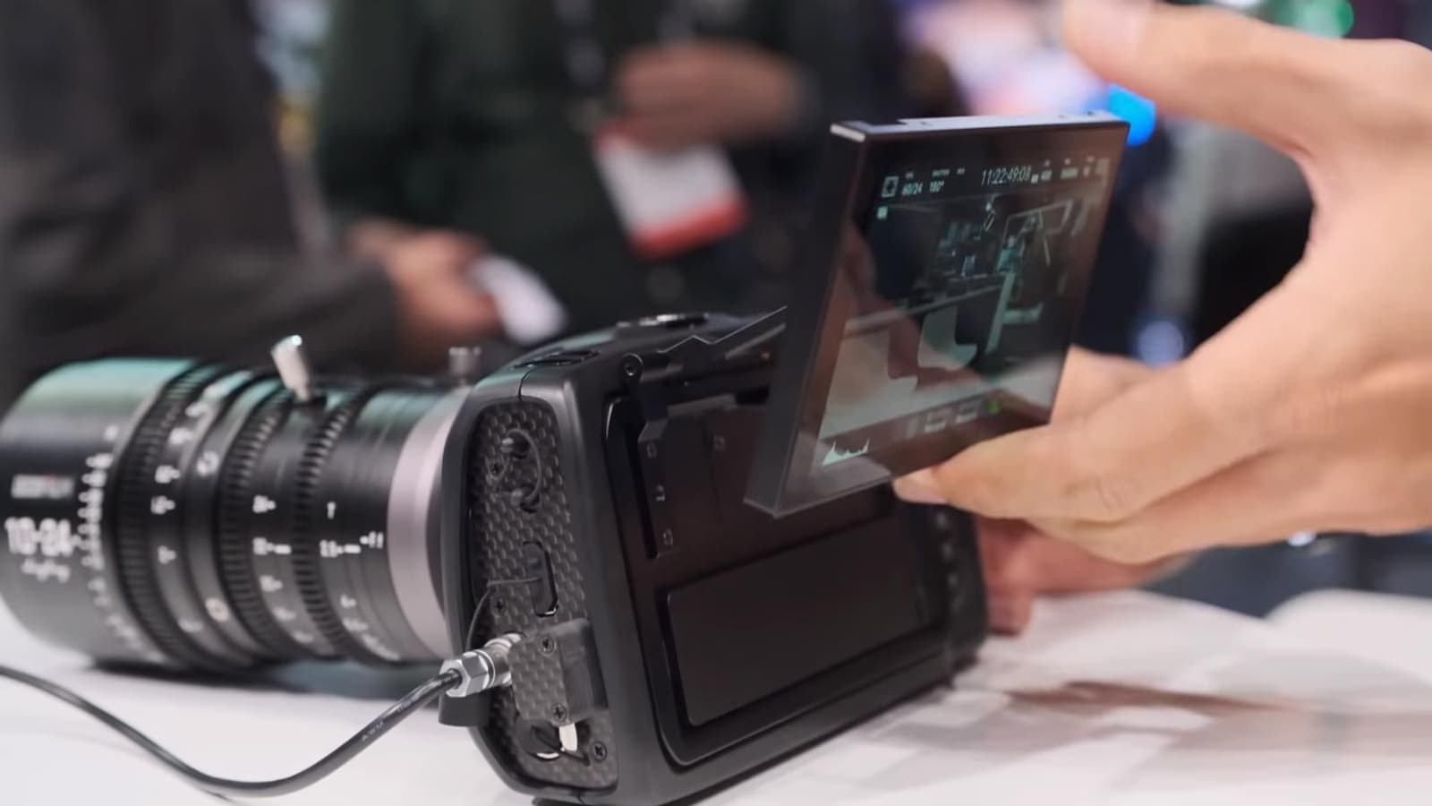 Напомним, камера поддерживает не только сменные носители SD и CFast, но и возможность подключения твердотельного накопителя по интерфейсу USB. После доработки разъем USB-C оказывается развернут в другую сторону, так что накопитель типоразмера M.2 в небольшом корпусе, включенном к комплект, размещается за экраном.