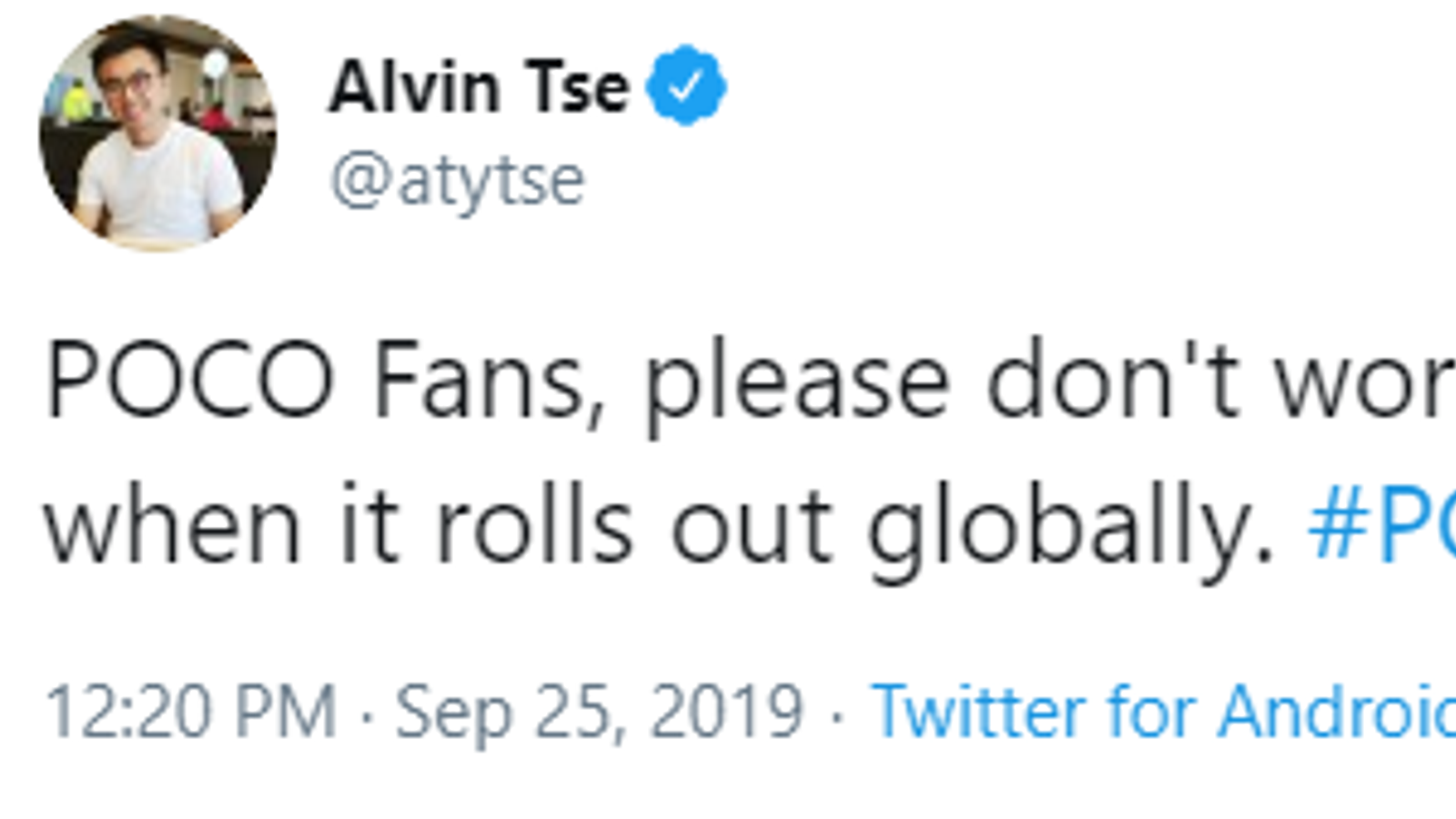 После вчерашней публикации планов Xiaomi по обновлению разных моделей до MIUI 11 пользователи Pocophone F1 приуныли: в перечне обновляемых моделей его не оказалось. Но MIUI 11 для этого смартфона точно выйдет, о чем сегодня объявил глава Pocophone Global Алвин Це (Alvin Tse).