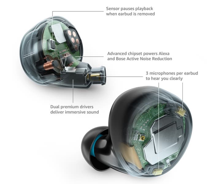 Автономность наушников заявлена равной 5 часам, суммарная с футляром — 20 часам. Что интересно и странно — для зарядки тут используется порт Micro-USB, и вряд ли у Amazon этому есть внятное объяснение. Также можно отметить защиту от брызг (IPX4) и наличие в наушниках ИК-датчиков, которые определяют, когда наушник был вынут из уха и дают команду приостановить воспроизведение. Само собой, тут имеется интегрированный голосовой помощник Alexa.
