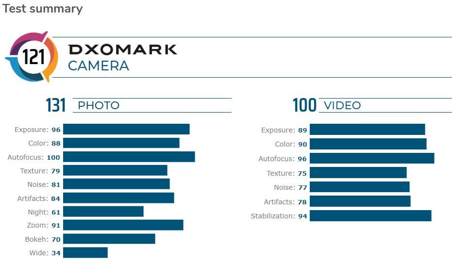 Аппарат получил 131 балл за съемку фото и 100 баллов за съемку видео, в сумме — 121 балл. Для сравнения, предыдущий лидер Samsung Galaxy Note 10+ 5G получил 126 баллов за съемку фото и 101 балл — за съемку видео, а в сумме у него — 117 баллов.