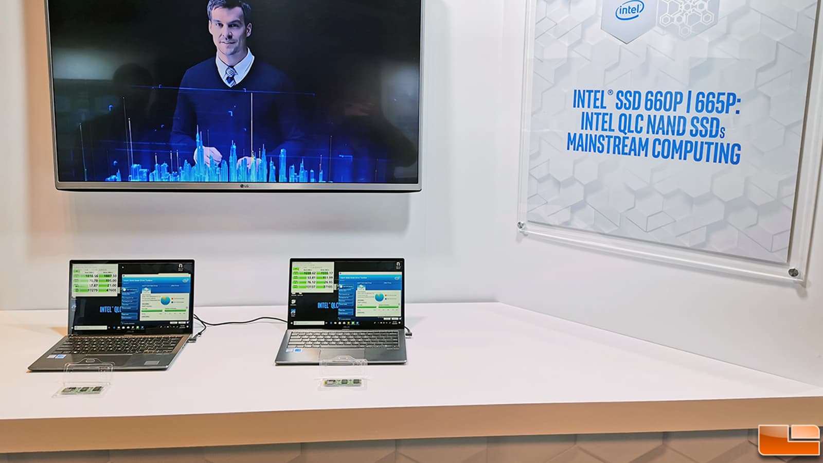 Демонстрационная установка состояла из двух идентичных ноутбуков ASUS, различие между которыми было в SSD. В одном случае это был накопитель Intel SSD 660p объемом 1 ТБ на 64-слойной флеш-памяти, а в другом — Intel SSD 665p объемом 1 ТБ на 96-слойной флеш-памяти. Для тестирования использовалось ПО CrysalDiskMark 7 Beta 2, которое в дополнение к скорости последовательной передачи данных и производительности на операциях с произвольным доступом показывает задержку доступа.