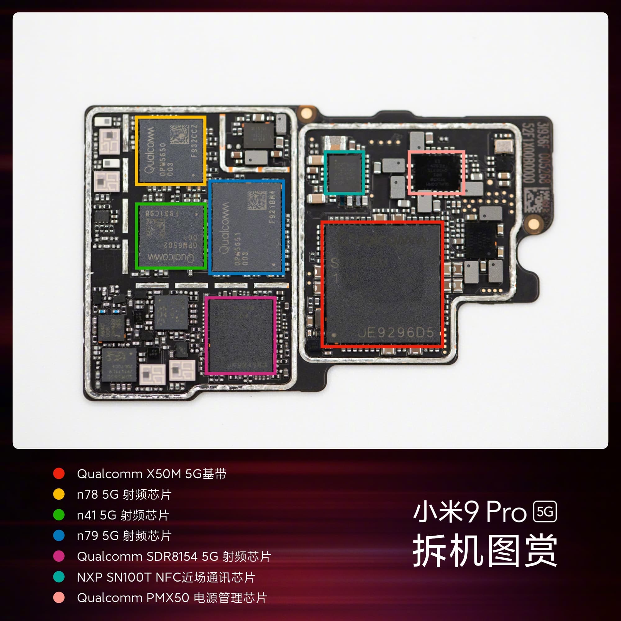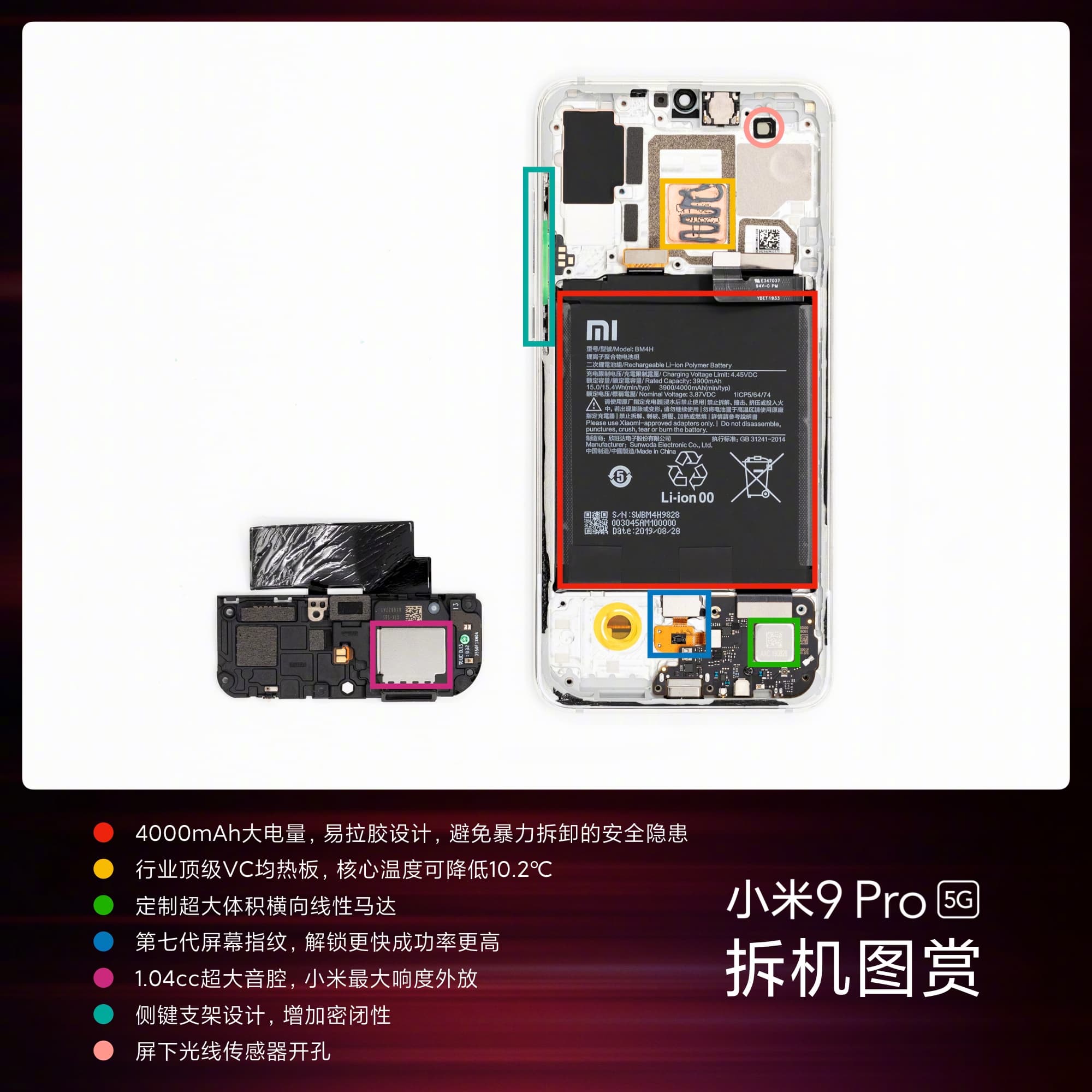 На фото можно увидеть все основные компоненты и модули смартфона, включая спираль для беспроводной зарядки, тройную основную камеру и фронтальную камеру, двухкомпонентную системную плату, такой дизайн обусловлен добавленной платформой для 5G, систему охлаждения, аккумулятор, специальный горизонтальный вибромоторчик с поддержкой 150 вариантов вибрации и многое другое.