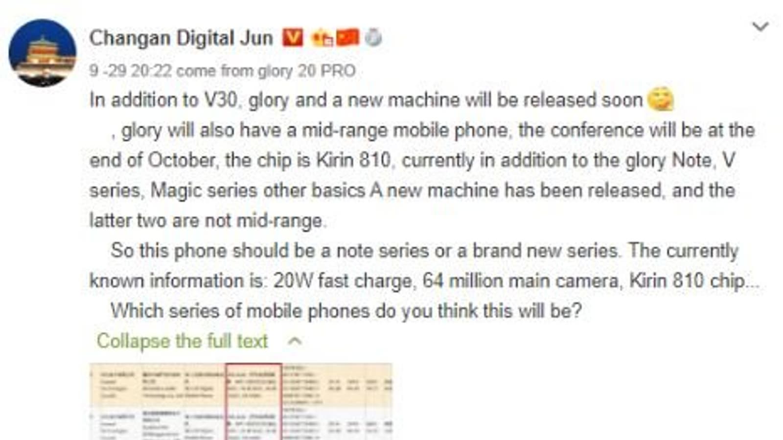 Вчера в Сети опубликовали фото экрана перспективного флагмана Honor V30 5G, а сегодня появились и первые подробности о дате анонса модели. Как сообщил китайский источник, Honor V30 5G представят на официальном мероприятии в конце октября. Причем флагман выйдет в сопровождении новой модели линейки Note (скорее всего, Note 10), или вообще совершенно новой серии.