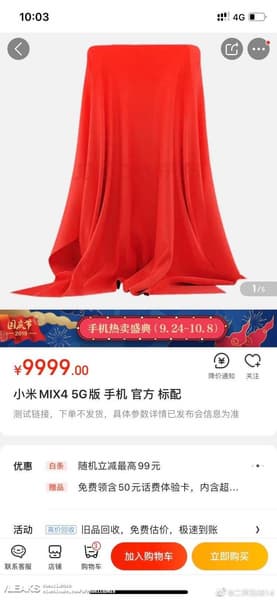 Страница-заглушка, на которой позже разместится Xiaomi Mi Mix 4, появилась в крупнейшем китайском онлайновом магазине TMall. Увы, смартфон спрятан за «покрывалом», стоимость не указана (точнее, в качестве нее тоже стандартная заглушка в 9999 юаней), ничего не говорится о сроках выпуска. Зато подтверждается факт наличия в смартфоне модема 5G.