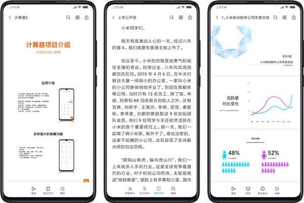 Mi Work и Mi Go составляют основу так называемого «продуктивного» пакета в MIUI 11. Офисный пакет Mi Work позволяет просматривать документы без установки сторонних приложений. Система позволяет показывать миниатюры и краткую статистику документов, что увеличивает удобство просмотра.