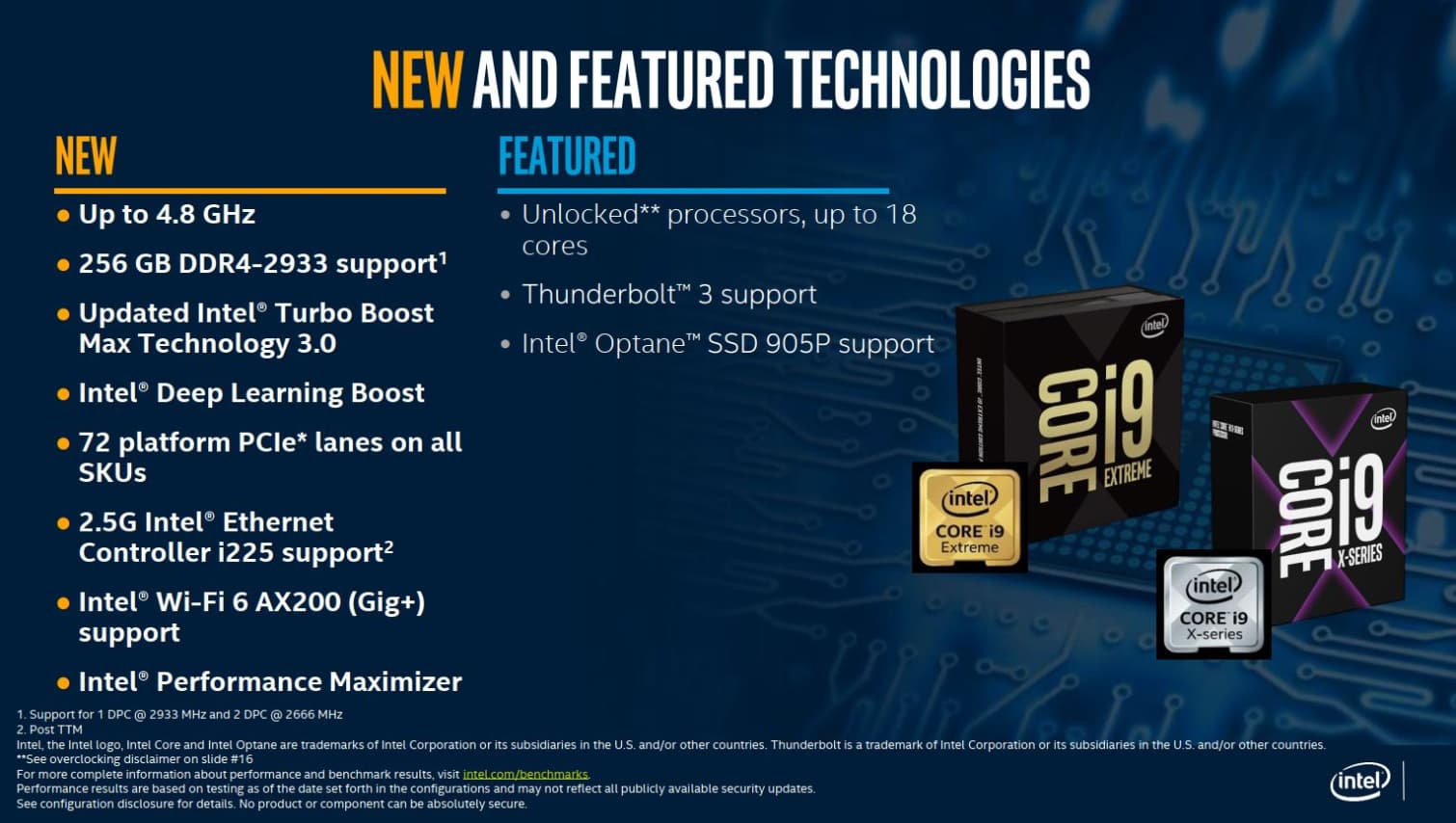 При этом Cascade Lake-X обеспечивают поддержку памяти DDR4-2933 МГц объемом до 256 ГБ и предлагают больше линий PCIe — 72, если считать суммарно с чипсетом. Также заявлена поддержка технологии Turbo Boost Max 3.0 и фирменного ПО автоматического разгона Performance Maximizer.
