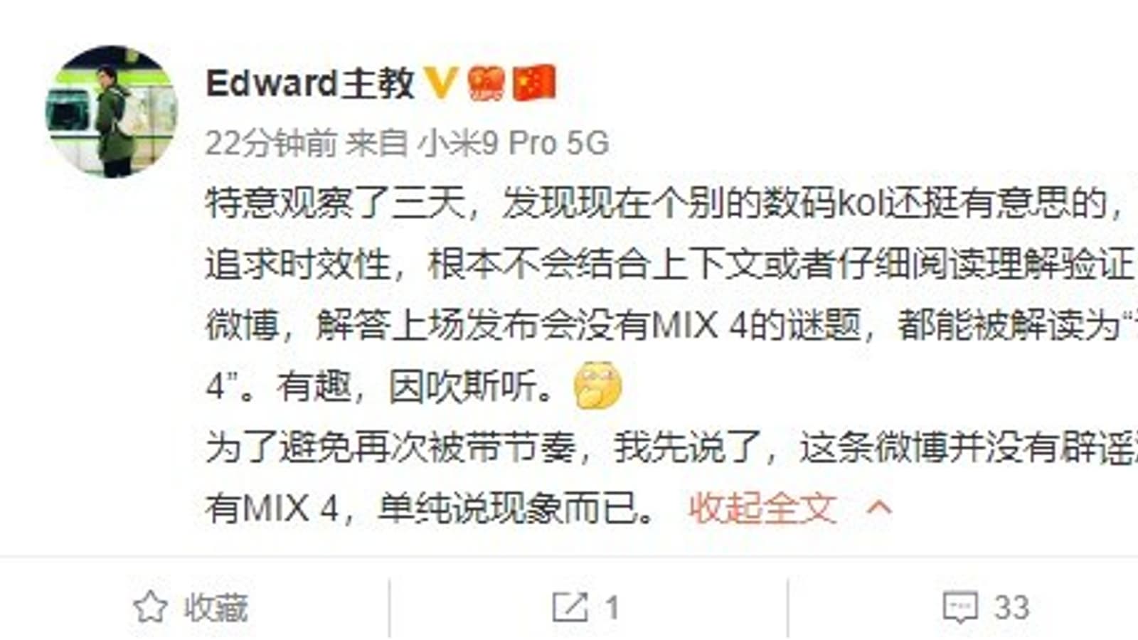 Интересно, что его опубликовал в Weibo тот же менеджер по продвижению бренда Эдвард Бишоп (Edward Bishop), слова которого послужили слухом об отмене Mi Mix 4. Три дня ему понадобилось для того, чтобы сообщить, что прошлое изречение попросту было неверно интерпретировано. В том сообщении Эдвард Бишоп просто хотел сказать, что никак не комментирует слухи о Mi Mix 4, а СМИ преподнесли эти слова как отмену модели.