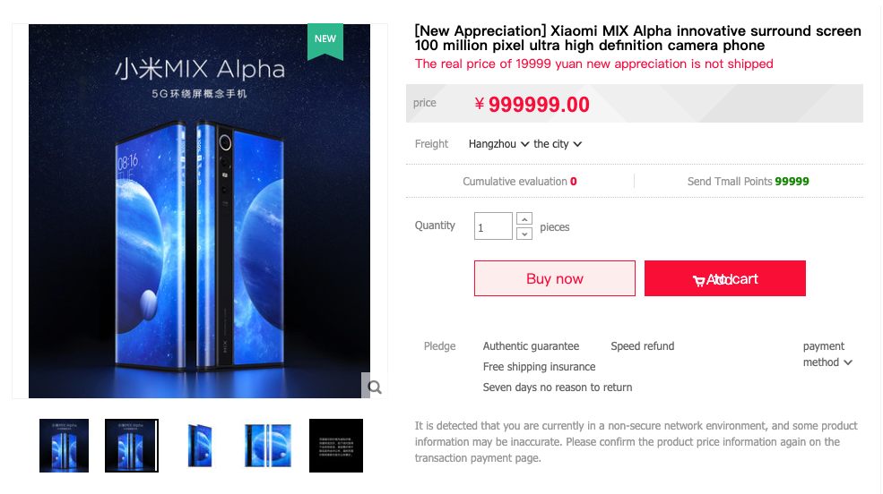 Казалось бы — это обычная практика для китайских магазинов — указывать большие круглые суммы для грядущих смартфонов, когда их точная цена не объявлена. Но, во-первых, официальная цена Xiaomi Mi Mix Alpha известна, а во-вторых, кнопки «Купить сейчас» и «Добавить в корзину» на этой страничке являются активными. Это означает, что желающие могут потратить указанную сумму на приобретение данного смартфона, по крайней мере, так утверждает источник.
