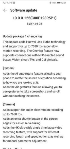 Прошивка EMUI 10 с номером 10.0.0.125 приносит также технологию Huawei Link Turbo и расширенную функциональность для OneHop. Объём обновления внушительный — 4,03 ГБ.