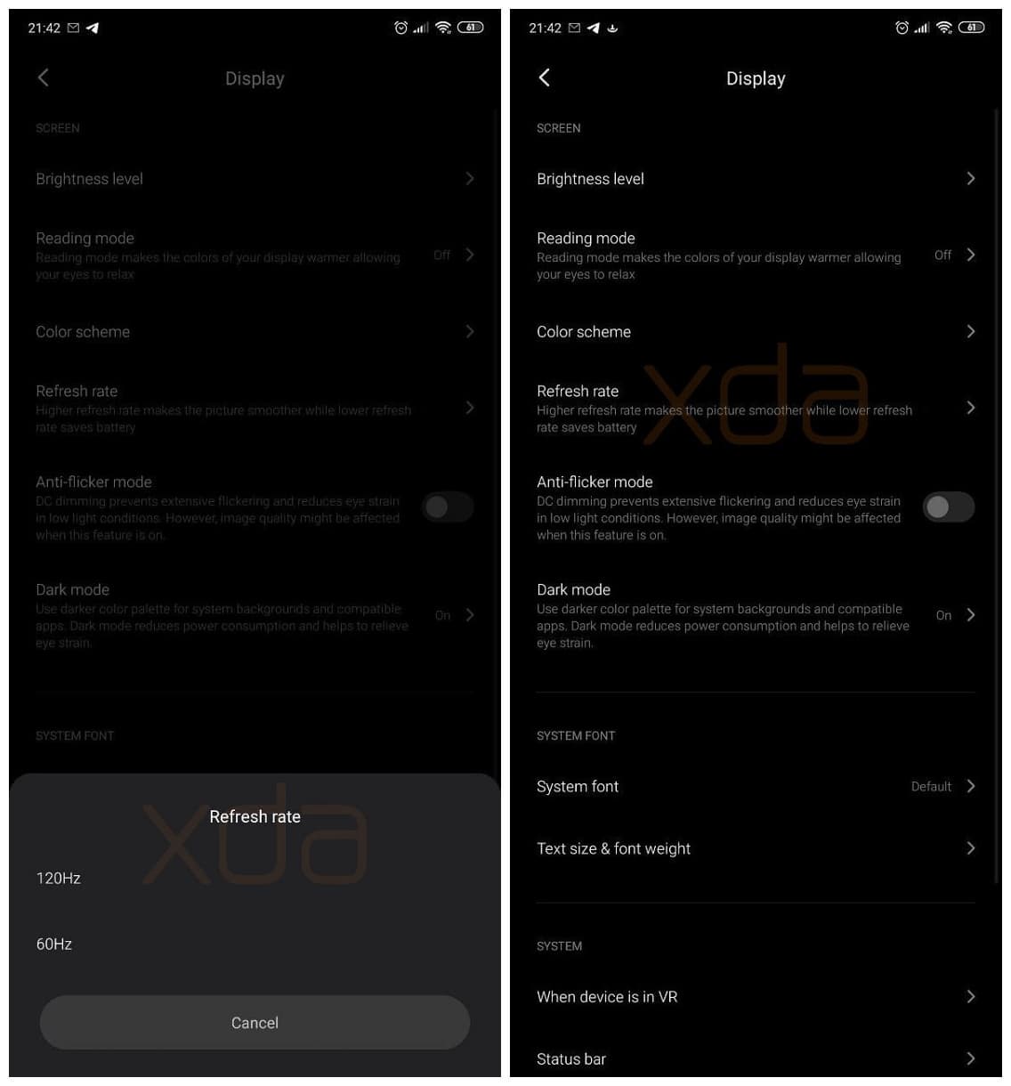 В бета-версии обнаружилась новая настройка частоты обновления дисплея. Согласно описанию, повышенные частоты делают картинку более гладкой, а пониженные экономят заряд аккумулятора. После дальнейших изысканий, в коде были найдены указания на два варианта частот — 60 и 120 Гц.