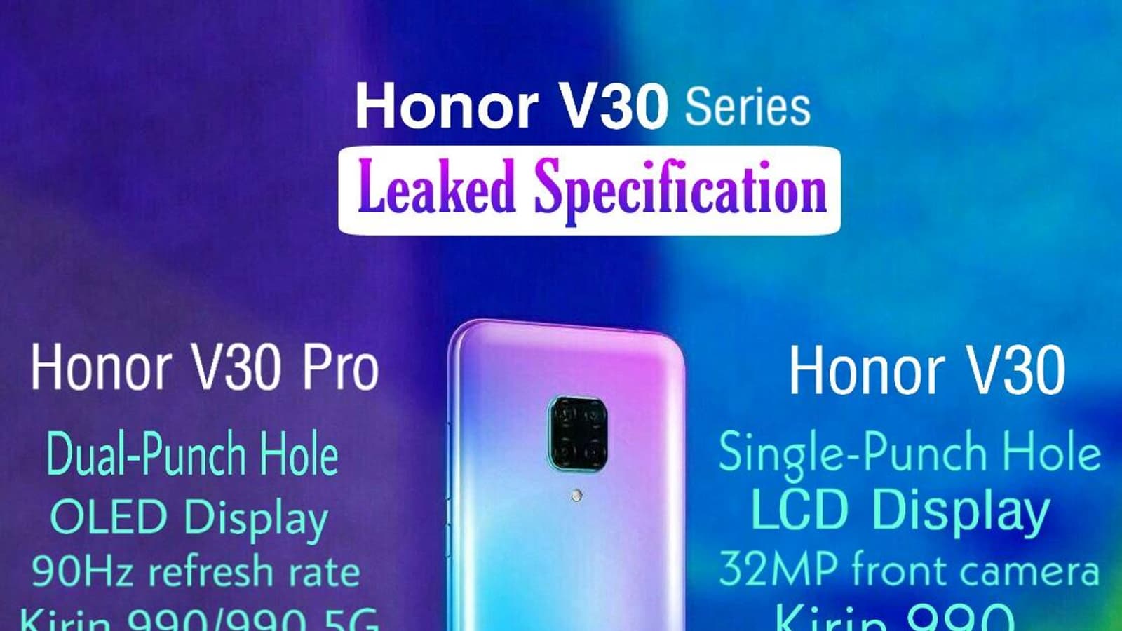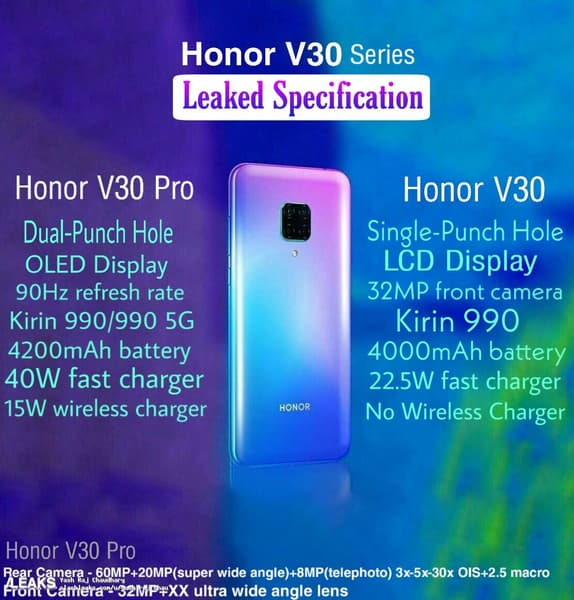 Младшая версия Honor V30 будет оснащена ЖК-экраном, тогда как Honor V30 Pro получит OLED-дисплей с частотой обновления картинки 90 Гц. Оба смартфона будут построены на базе однкористальной системы Kirin 990, но только Honor V30 Pro будет иметь версию с поддержкой сетей пятого поколения.