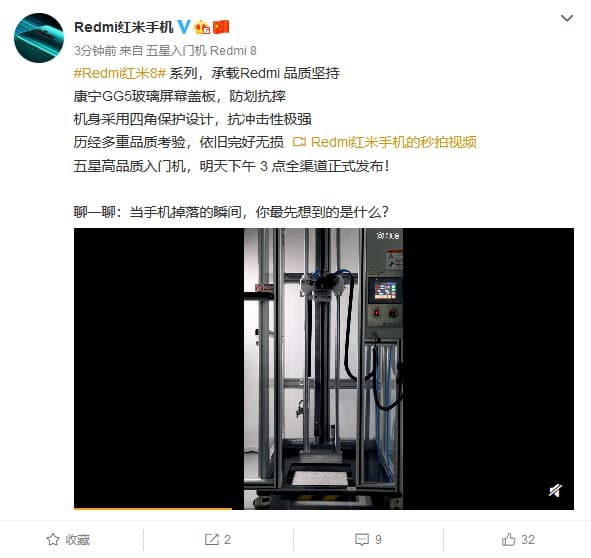 Углы корпуса традиционно усилены, а защиту экрана обеспечивает закаленное стекло Gorilla Glass 5 — его едва ли найдешь в других смартфонах той же ценовой категории. Так что для таких бюджетных устройств защитные свойства должны оказаться если не выдающимися, то хорошими уж точно. В доказательство Лю Вейбинг опубликовал видео, в котором специальная машина испытывает Redmi 8 на стойкость к падениям в заводских условиях. Увы, самого видео нет, но в описании говорится, что что аппарат выдержал серию таких тестов без каких-либо повреждений.