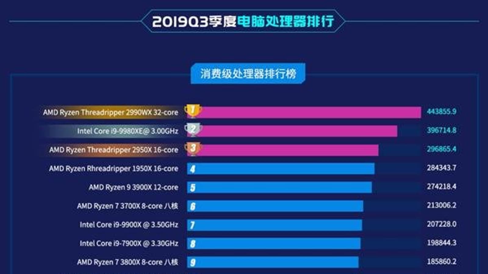 Первое место рейтинга закрепил за собой 32-ядерный AMD Ryzen Threadripper 2990WX, а на втором месте обосновался 18-ядерный Intel Core i9-9980XE. Учитывая, что CPU Cascade Lake-X еще толком не появились в сборках, а Ryzen Threadripper 3000 дебютируют только в ноябре, можно думать, что эти же процессоры возглавят аналогичный рейтинг за четвертый квартал текущего года.