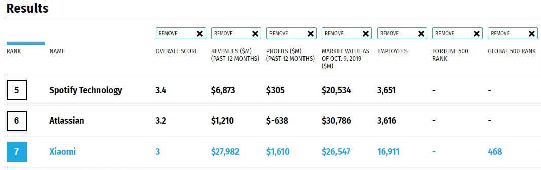В прошлом году Xiaomi в этом перечне вообще не было, а сейчас она закрепила за собой седьмое место. Многие более именитые компании остались позади. В их числе Alibaba Group Holding (11 место), Tencent Holdings (12 место), Twitter (13 место), Alphabet (18 место), Adobe (25 место), Nvidia (26 место), Amazon.com (31 место), Visa (43 место), Tesla (48 место) и Facebook (49 место).