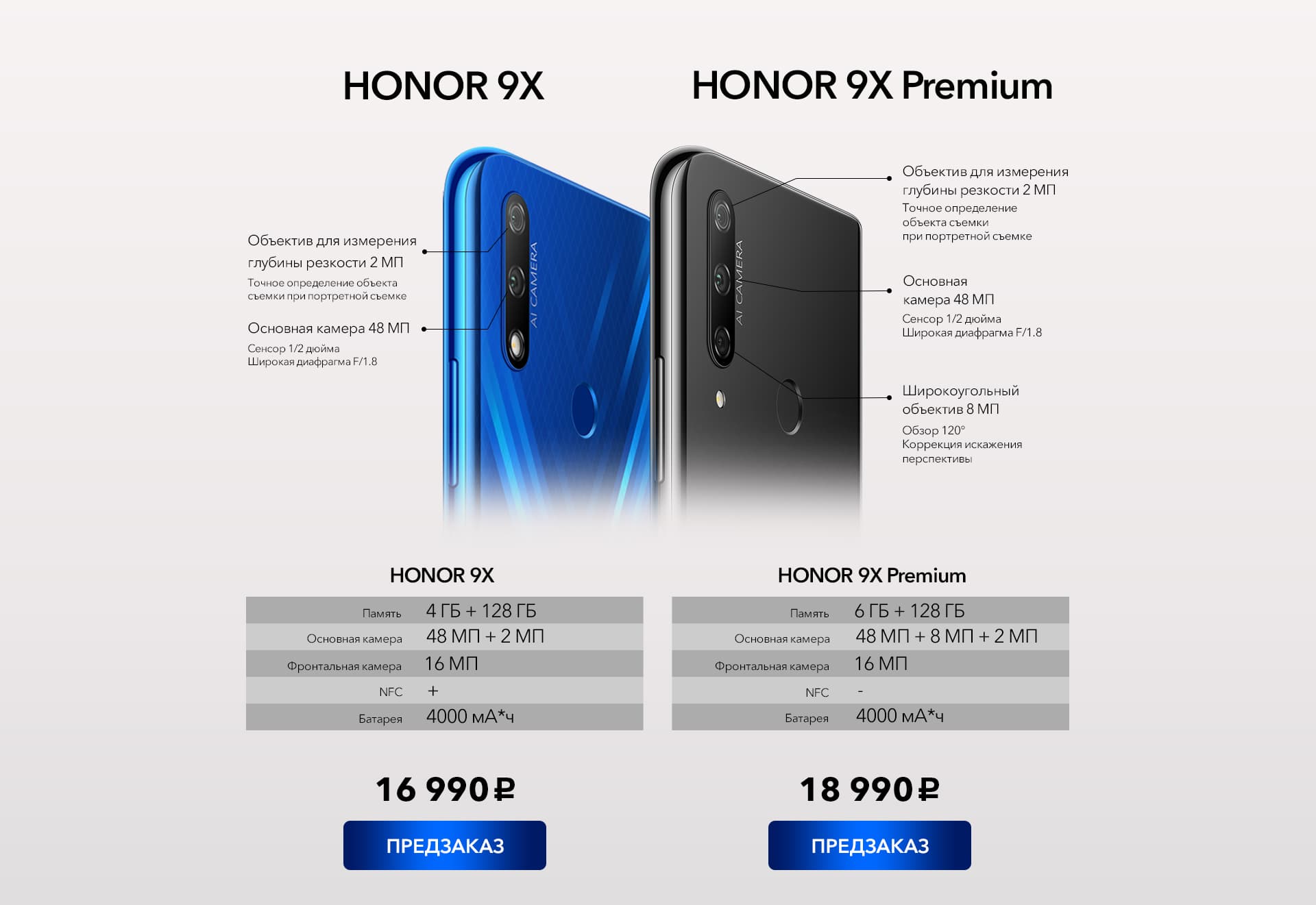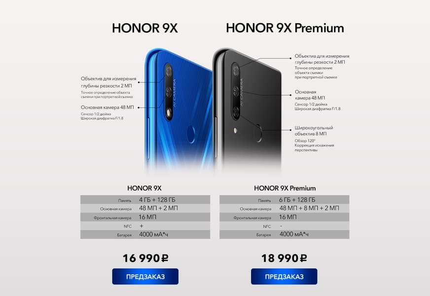 Продажи Honor 9X и Honor 9X Premium начнутся 8 ноября. Приём предварительных заказов откроется завтра. Рекомендованная розничная цена составляет 16 990 и 18 990 рублей, соответственно. Оформившие предварительный заказ получат фитнес-браслет Honor Band 5 бесплатно.