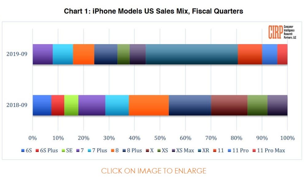 Компания Consumer Intelligence Research Partners (CIRP) опубликовала статистические данные за очередной финансовый квартал Apple, закончившийся 28 сентября 2019 года. По подсчетам CIRP, на новые модели iPhone 11, 11 Pro и 11 Pro Max в США пришлось 20% продаж. Отметим, что эти аппараты стали доступны всего две недели до конца отчетного периода.