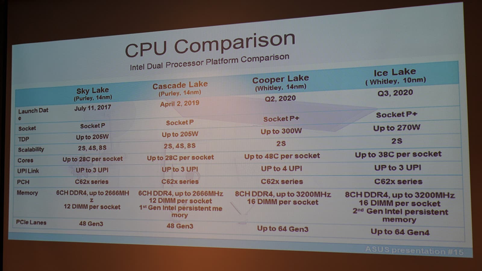 В сети появились сведения о новейших серверных процессорах Intel. Выход процессоров Cooper Lake-SP, которые станут первыми представителями новой платформы Whitley, планируется во втором квартале 2020 года. Для Cooper Lake-SP будет характерно значение TDP 300 Вт. Ядер будет до 48, но также должна быть модель с 56 ядрами, такая как Xeon Platinum 9282. Ее TDP составит 400 Вт. Конфигурация Cooper Lake-SP включает до 64 линий PCIe 3.0, восемь каналов памяти (для 16 модулей DIMM), поддерживающих эффективную частоту до 3200 МГц и четыре канала Ultra Path Interconnect (UPI).