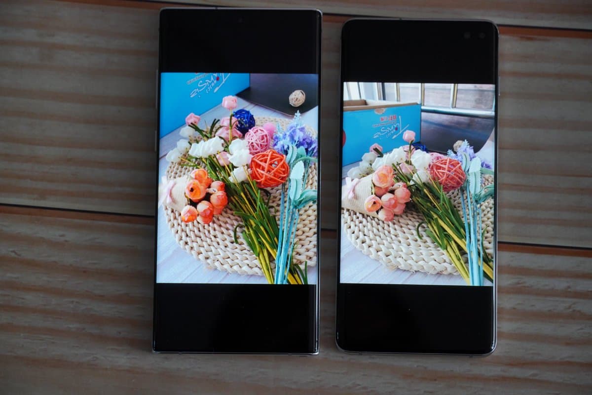 Смартфоны хорошо различимыми по форме и расположению фронтальных камер, но даже если показать просто снимки без самих смартфонов, но видно, что на Samsung Galaxy S10+ цвета получаются не такими насыщенными.