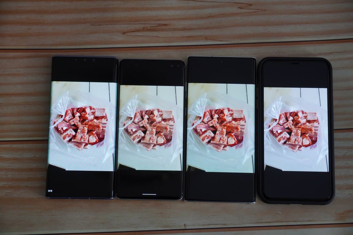 На следующей фотографии показываются снимки, сделанные в режиме «Еда» на Samsung Galaxy S10+ с OneUI 2.0, а также на смартфоны Huawei Mate 30 Pro, Samsung Galaxy Note10 и iPhone 11. В режиме «Еда» цвета делаются более насыщенными.