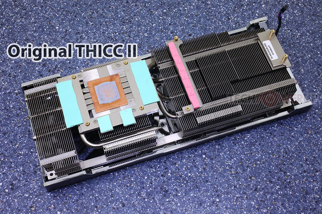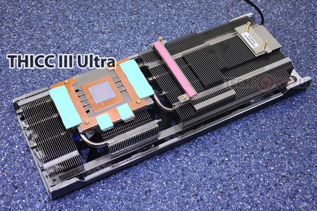 Модель THICC III отличается от THICC II немного удлиненным алюминиевым радиатором и второй медной пластиной в основании, сменившей алюминиевую. Она отводит тепло от микросхем памяти GDDR6. Кроме того, удалена фольга между основанием и радиатором, а на радиаторе закреплено три вентилятора вместо двух.