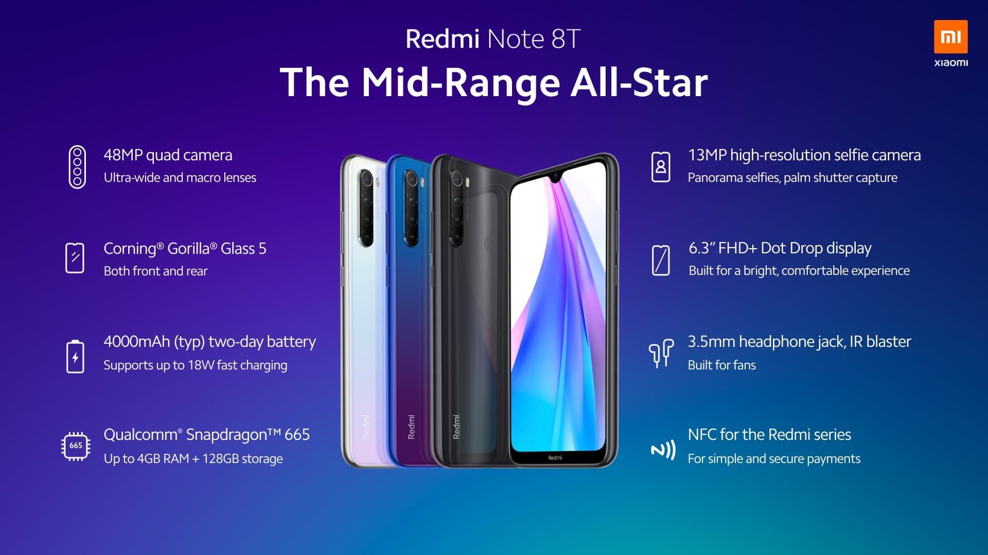 Redmi Note 8T оснащается 6,3-дюймовым экраном с разрешением Full HD+ (2340 х 1080 пикселей), основной камерой с датчиками разрешением 48, 8, 2 и 2 Мп, 13-мегапиксельной фронтальной камерой, однокристальной системой Snapdragon 665, аккумулятором ёмкостью 4000 мА·ч
