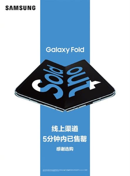 По факту, чтобы распродать весь объем Galaxy Fold через все доступные онлайновые площадки, потребовалось всего 5 минут. Компания даже выпустила тизерную картинку, чтобы отметить этот невероятный успех модели у китайских потребителей, взращенных на дешевых Xiaomi и Meizu.