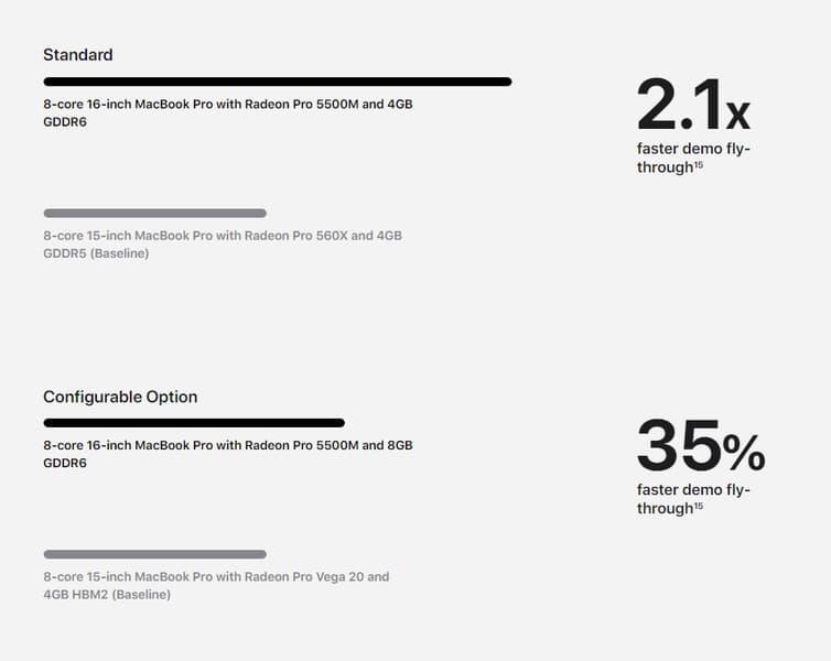 Итак, Radeon Pro 5300M получила 1280 потоковых процессоров, 4 ГБ памяти GDDR6 и 128-разрядную шину. Radeon Pro 5500M получила 1536 потоковых процессоров, 4 либо 8 ГБ памяти GDDR6 и такую же шину.