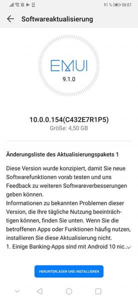 Прошивка с номером 10.0.0.154 доступна для смартфонов Huawei Mate 20 и Huawei Mate 20 Pro с установленной EMUI 9.1, а для модели Huawei Mate 20 X (4G) — с номером 10.0.0.180.