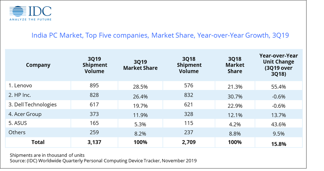 Согласно подсчетам IDC, с июля по сентябрь было отгружено 3,1 млн ПК, что на 15,8% больше по сравнению с тем же периодом прошлого года. Поставки настольных ПК в годовом выражении выросли на 10,6%, ноутбуков — на 18%. Как утверждается, рост был в основном обусловлен вторым этапом поставок продукции компании ELCOT (Electronics Corporation of Tamil Nadu) в рамках инициативы по бесплатному распространению ноутбуков. Кроме того, сказывается приближение прекращения поддержки Windows 7, побуждающее корпоративных пользователей обновлять системы в связи с переходом на Windows 10.