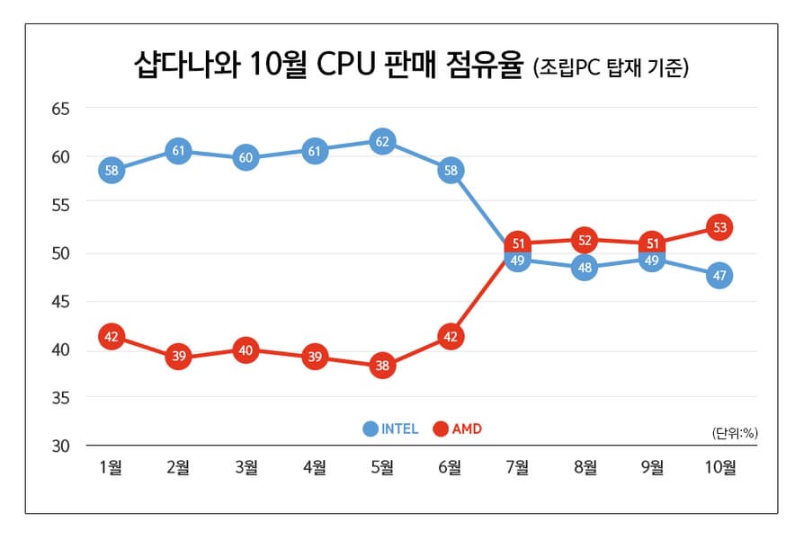 Источник опубликовал новые данные о продажах процессоров в Южной Корее, и для Intel в этой порции статистики нет ничего хорошего: доля «синих» продолжает падать.
