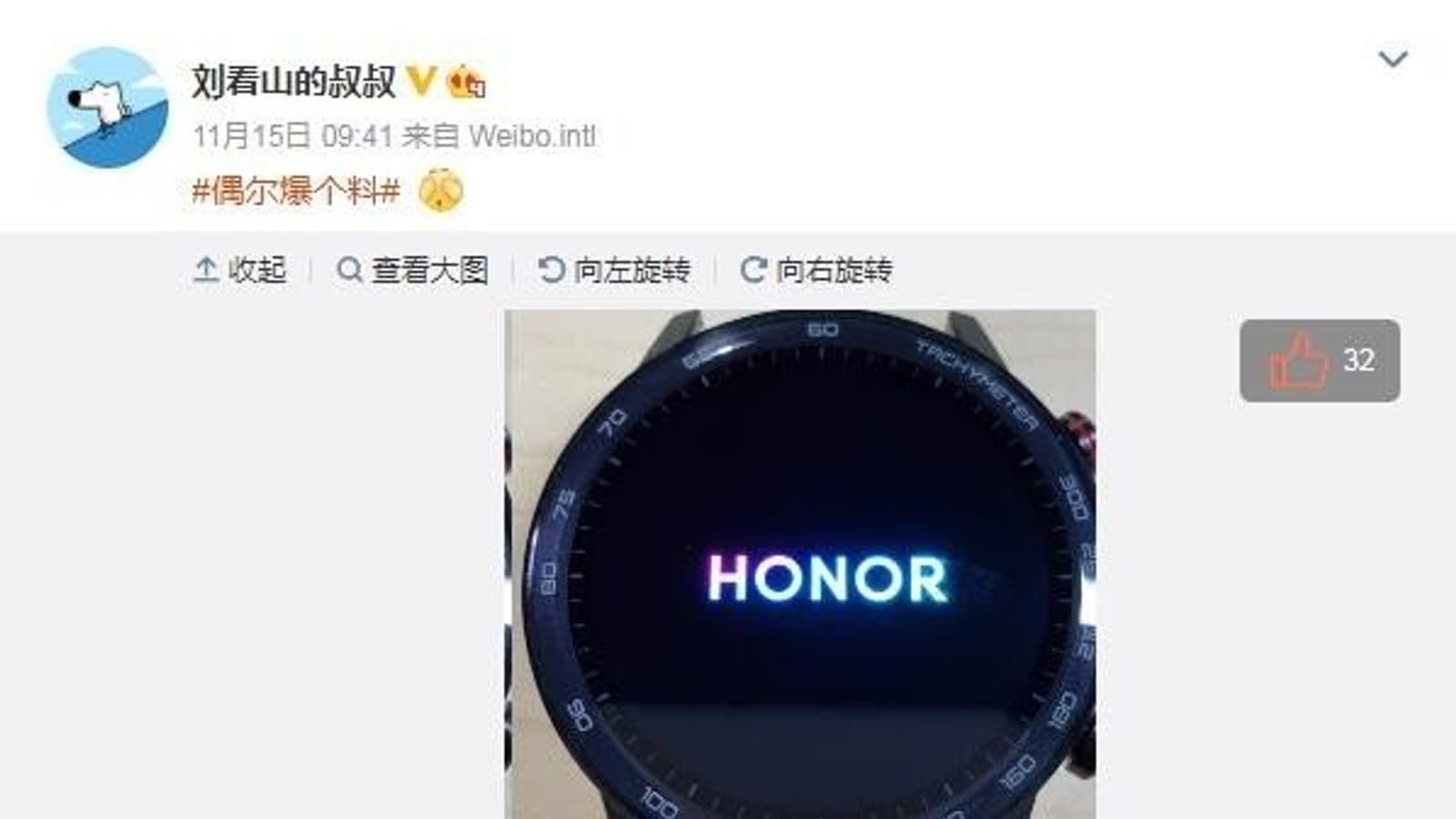 На фото показаны включённые часы со светящимся логотипом Honor. По данным источника, часы унаследовали общий дизайн прошлогодних Honor Magic Watch и размер 46 мм.