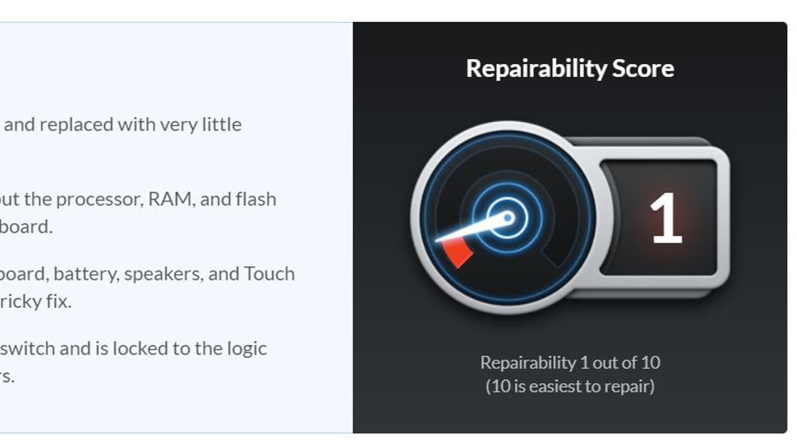Единственный позитив, отмеченный специалистами, это относительно простая замена панели управления курсором. А дальше… CPU, ОЗУ и флэш-память, распаянные на системной плате – это раз. Два – клей и заклепки, фиксирующие клавиатуру, аккумулятор, громкоговорители и сенсорную панель Touch Bar. До кучи сенсор Touch ID, выполняющий роль кнопки включения, встроенный в логическую плату. Все это вызывает большие проблемы при ремонте ноутбука, как результат, ремонтопригодность устройства оценена в 1 балл из 10.