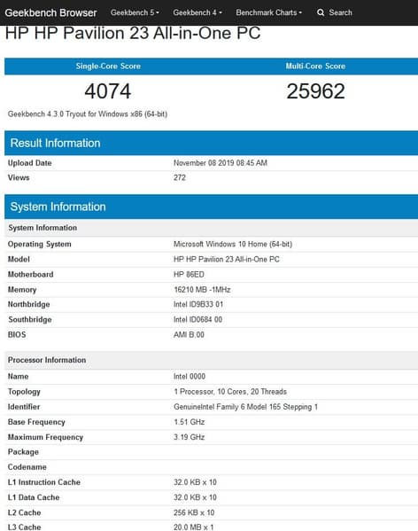 Названия CPU нет, но мы видим, что у него действительно 10 ядер, а частоты работы — 1,5-3,2 ГГц. Они достаточно низкие, так что перед нами либо ранний инженерный образец, либо энергоэффективная версия 10-ядерного CPU. Но, если верить недавней утечке, даже Core i9-10900T будет работать на намного более высоких частотах. Поэтому на результаты теста внимания обращать не будем.
