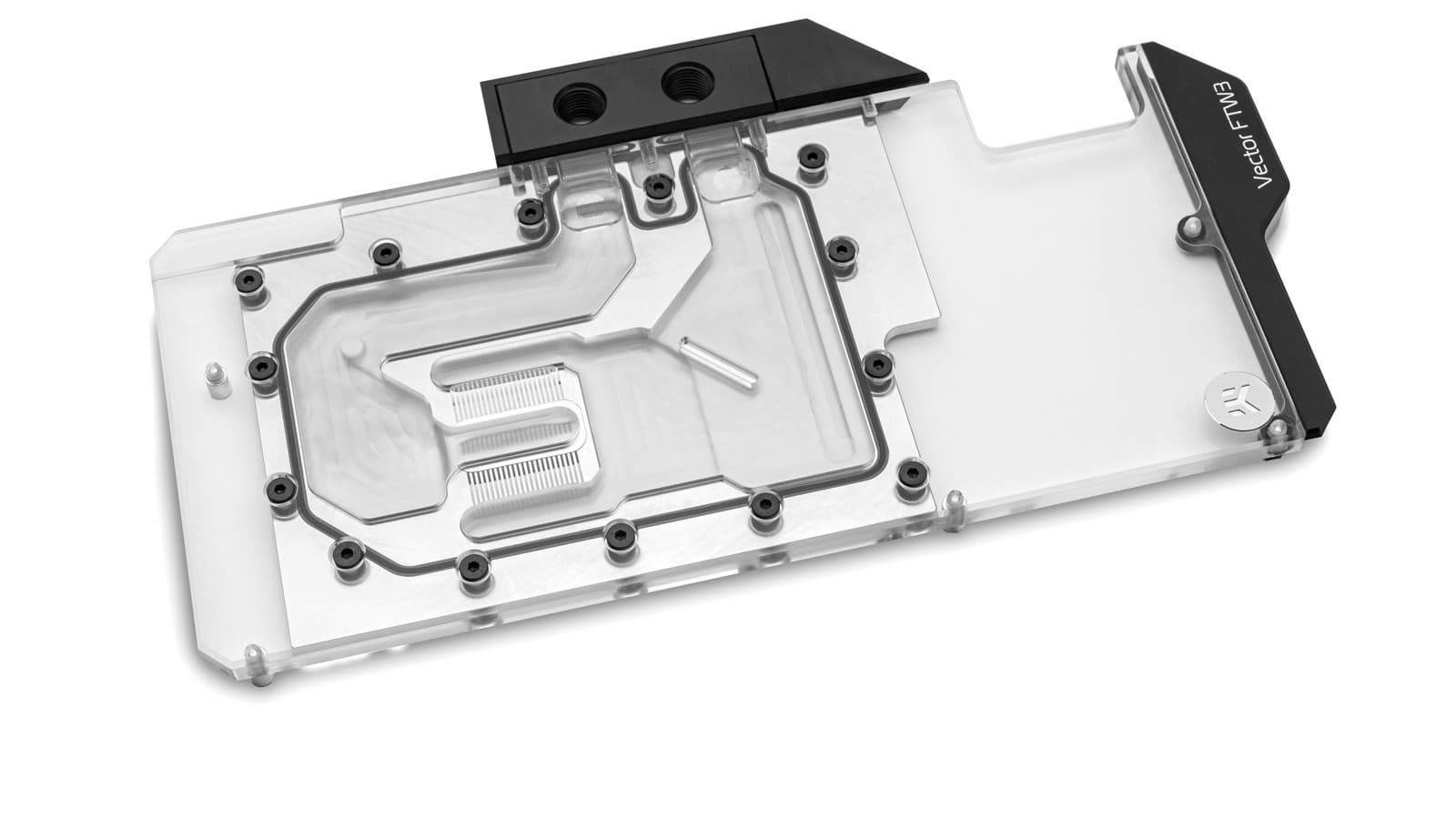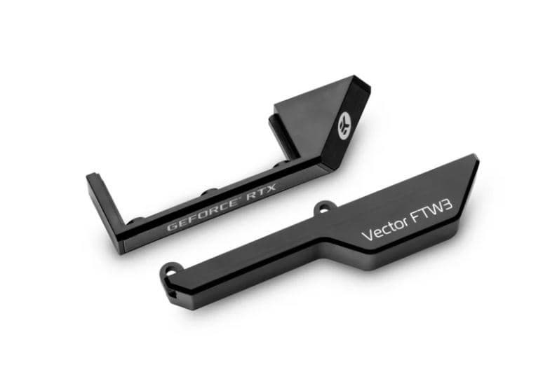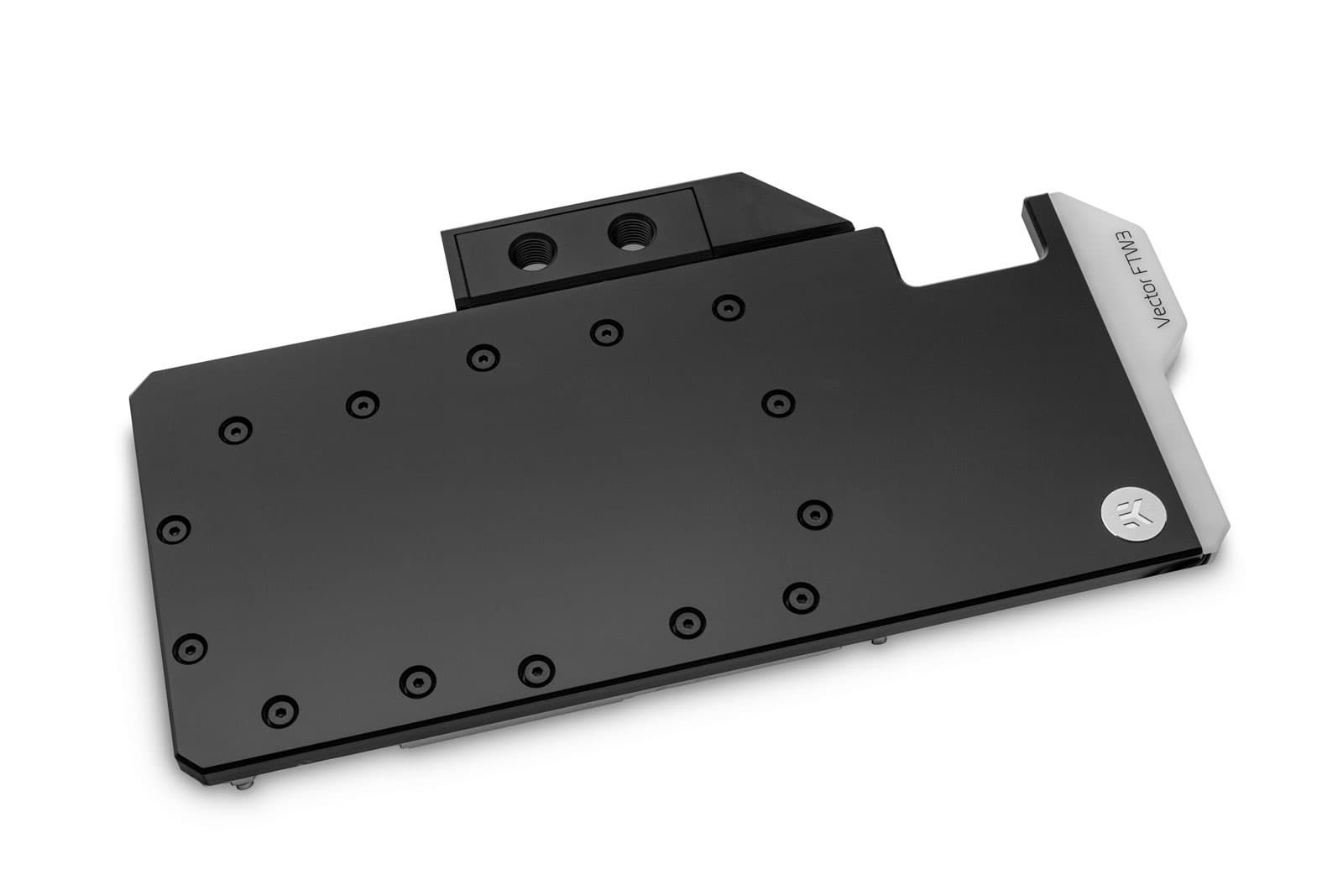 Основание водоблока изготовлено из меди и никелировано, крышка — из прозрачного или черного пластика. Дополнительно можно приобрести пластину, закрепляемую на тыльной стороне печатной платы, которая обеспечивает дополнительное пассивное охлаждение и придает видеокарте более эстетичный вид. Производитель делает уточнение, что водоблоки серии EK-Vector FTW3 RTX несовместимы со штатными пластинами видеокарт EVGA RTX FTW3.