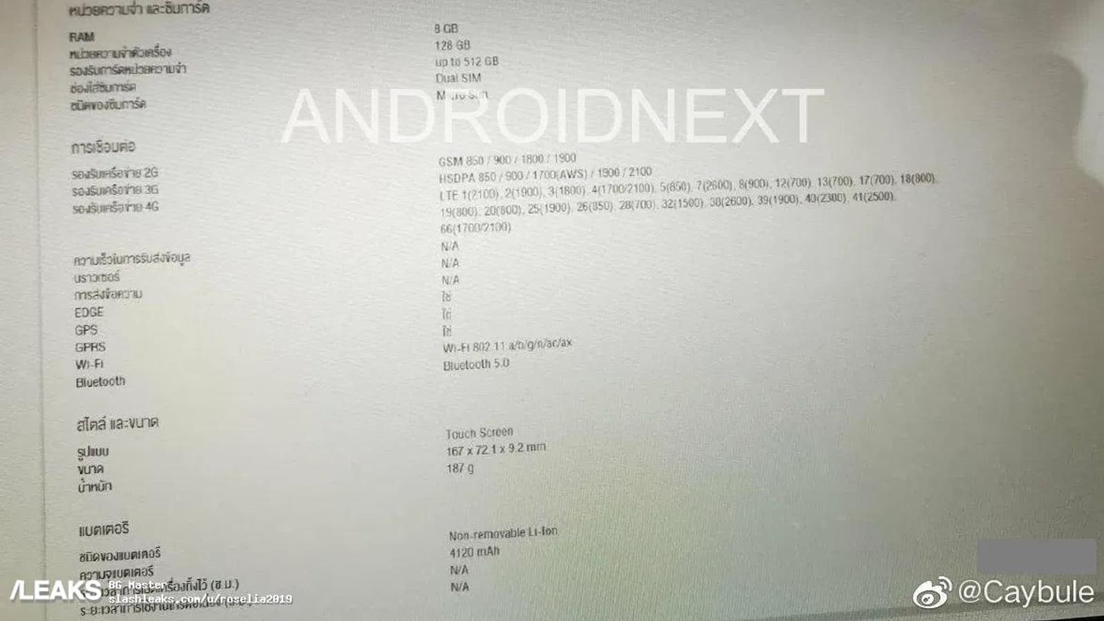 Дисплей OLED характеризуется диагональю 6,5 дюйма, а его разрешение — 3840 х 1644 пикселя. Также видна емкость аккумуляторной батареи (4120 мА·ч), приводятся габариты и масса устройства — 167 х 72,1 х 9,2 мм и 187 граммов.