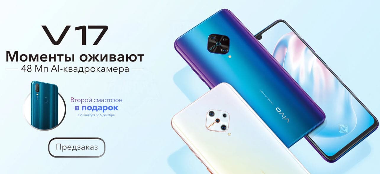 Также будет продолжена специальная акция на новейший смартфон V17, оснащенный камерой-бриллиантом: при предзаказе новинки покупатель получает в подарок второй смартфон — Y11 с диагональю 6,35 дюймов и аккумулятором ёмкостью 5000 мА·ч.