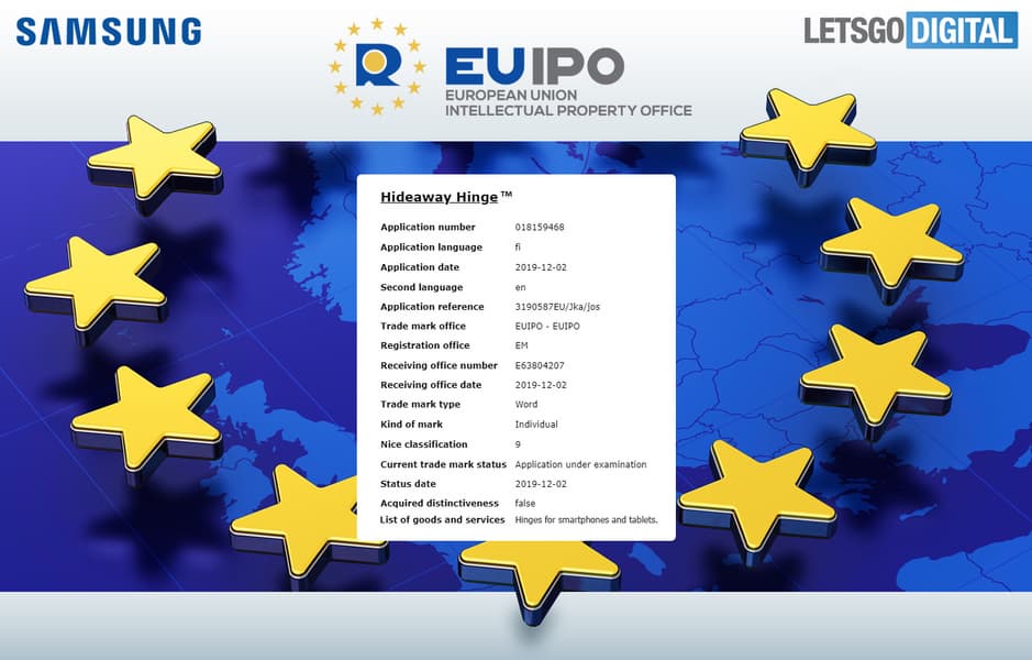 Теперь Samsung Electronics зарегистрировала торговую марку Hideaway Hinge (откидной шарнир) в Бюро интеллектуальной собственности Европейского союза. Заявку подали в Финляндии с таким описанием: смартфоны, планшетные компьютеры, шарниры в вид компонентов для смартфонов и планшетов.