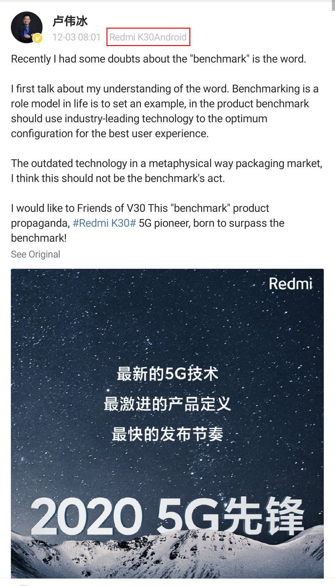 В Сети появилась новая порция подробностей о Redmi K30, и по доброй традиции ее представил глава бренда Redmi и вице-президент Xiaomi Лю Вейбинг (Lu Weibing). В новом своем сообщении в Weibo он поразмышлял на тему бенчмарка – своеобразного стандарта индустрии, на который равняются все. В плане смартфонов таким бенчмарком оказался Honor V30 – с хорошей камерой, отличной производительностью и быстрым модемом 5G. Но Лю Вейбинг считает, что Redmi K30 будет еще лучше.